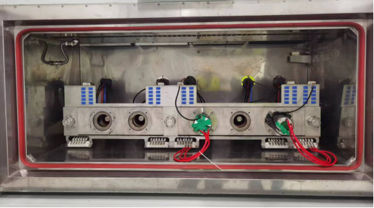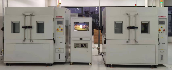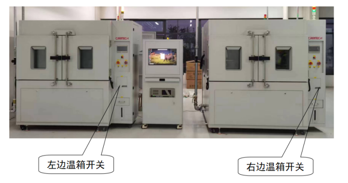 该测试系统包含两个温箱、两个工装台、两个电控箱和一个控制台;左右各五工位电机,可以测试电机在不同温度工况下负载循环和时间循环耐久性能