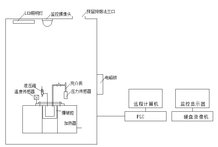 根据上图所示:加热器给爆破腔持续加热直至爆破腔里面的电池燃烧,通过压力传感器将压力采集带计算机软件上面,试验过程中实时显示当前试验温度、试验压力、时间,并记录试验结果、方便数据分析处理及可打印输出报告。